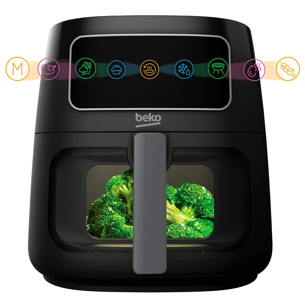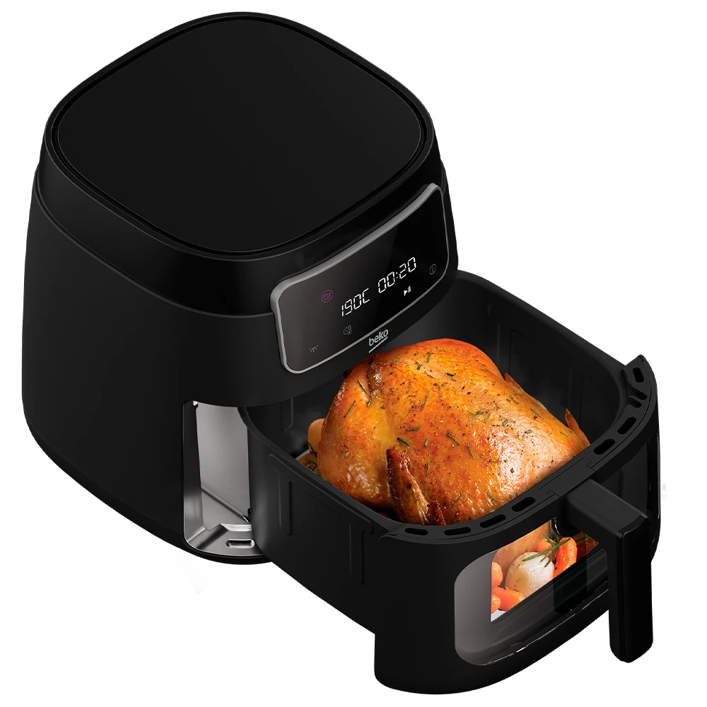 Aerogrill Beko FRL3374B 7.6 l este o solutie comoda pentru cei care vor sa gateasca mai rapid si mai “curat” acasa: crusta rumenita apare datorita circulatiei aerului fierbinte, iar cantitatea de ulei poate fi redusa vizibil. Vasul mare de 7,6 l este potrivit nu doar pentru o portie, ci si pentru cine in familie, cand vrei sa gatesti dintr-o data mai mult.