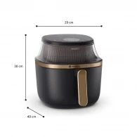 Carcasa este din plastic, iar dimensiunile de 39.7 x 28.6 x 29.4 cm iti permit sa pui aerogrill-ul pe blat, pastrand loc pentru alte aparate. Greutatea de 4.6 kg ajuta la mutare sau depozitare. Beneficiezi de garantie 24 de luni, iar tara de productie este China.