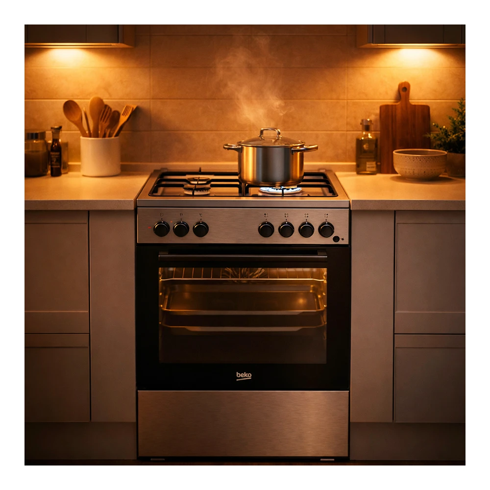 Aragazul Beko FBSE62120XD este o alegere practica pentru bucatarii in care vrei plita pe gaz, dar si coacere precisa intr-un cuptor electric. Latimea de 60 cm se potriveste in majoritatea spatiilor standard, iar suprafata din inox arata curat si se sterge usor dupa gatit. Cele 4 arzatoare pe gaz iti ofera control rapid al flacarii.