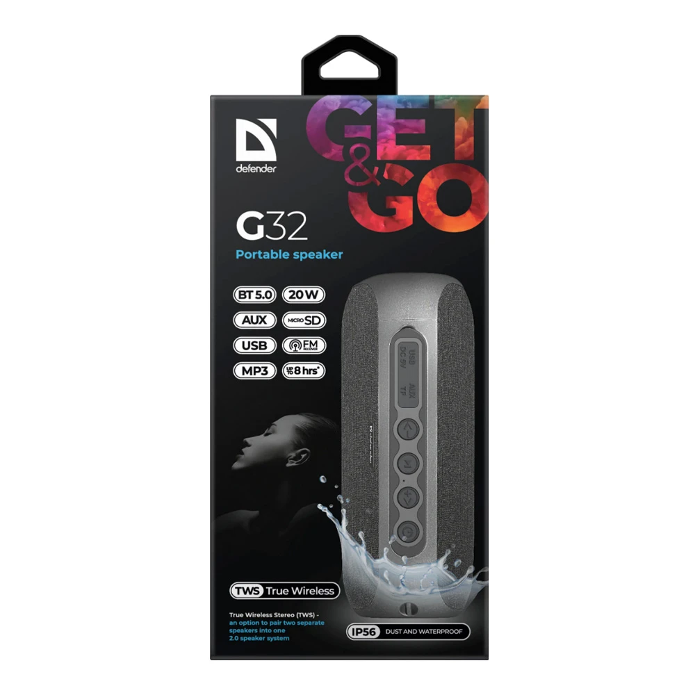 Boxa portabila Defender G32 (art. 65232) este o boxa Bluetooth compacta de 20 W, potrivita pentru casa, plimbari si calatorii, atunci cand vrei un sunet puternic intr-un format mic. Modelul este o acustica activa 2.0 si reda frecvente in intervalul 85–20000 Hz, fiind potrivita atat pentru muzica de fundal, cat si pentru piese energice. Carcasa este realizata din plastic cu elemente textile si cauciuc, iar protectia IP65 ajuta impotriva prafului si stropilor de apa.