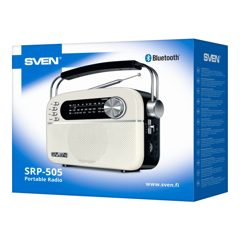 Radio portabil SVEN SRP-505 este un dispozitiv compact pentru receptia posturilor in benzile FM si AM, potrivit pentru utilizare acasa, la tara sau in timpul calatoriilor. Modelul functioneaza in banda FM 87,5–108 MHz si AM (MW) 530–1600 kHz, permitand receptionarea majoritatii posturilor radio populare.