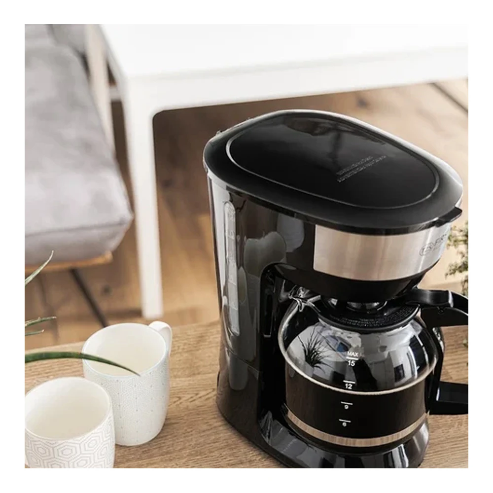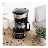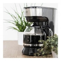 Carcasa din plastic, in culoare neagra universala, arata ordonat in orice bucatarie. Cu greutatea de 1,4 kg si dimensiunile 27,5 x 18 x 30 cm, cafetiera se poate muta usor sau aseza pe o suprafata compacta.