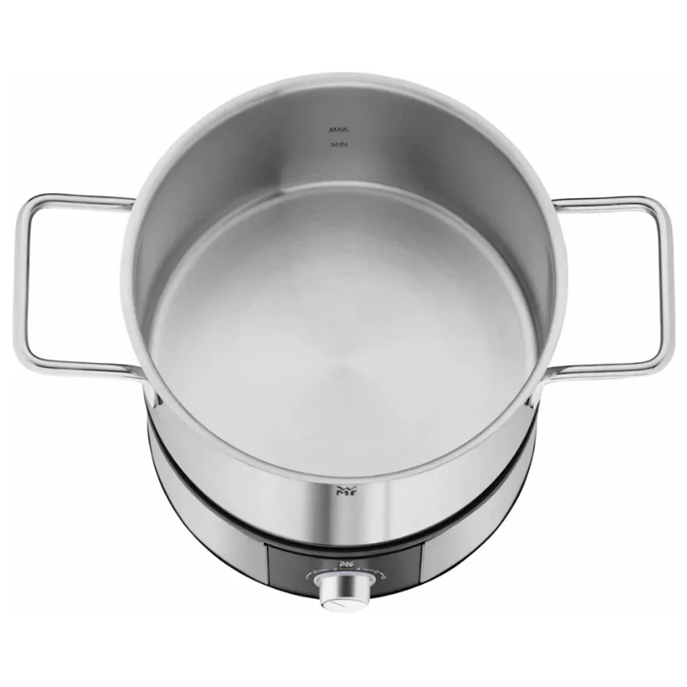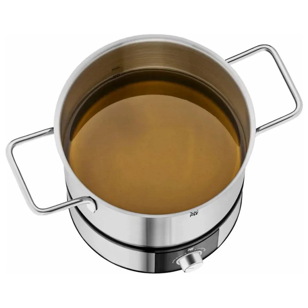 Modelul WMF 415130011 are puterea de 1400 W, un avantaj important pentru incalzire rapida si functionare stabila in timpul prepararii. Volumul vasului este de 1,5 litri, suficient pentru o cina in familie, o seara in doi sau pentru servirea gustarilor calde unui grup restrans. Cablul de alimentare de 1,2 m ofera mai multa libertate la amplasarea aparatului pe masa sau pe blatul de lucru.