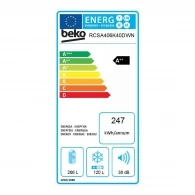La eficienta energetica, Beko RCSA406K40DWN este incadrat in clasa E (scara A–G), cu un consum anual de aproximativ 254 kWh. Nivelul de zgomot este mentionat la 38 dB (clasa C), iar clasa climatica este SN–ST, potrivita pentru conditii obisnuite de apartament. Usile sunt reversibile, astfel incat alegi sensul de deschidere in functie de mobilier.