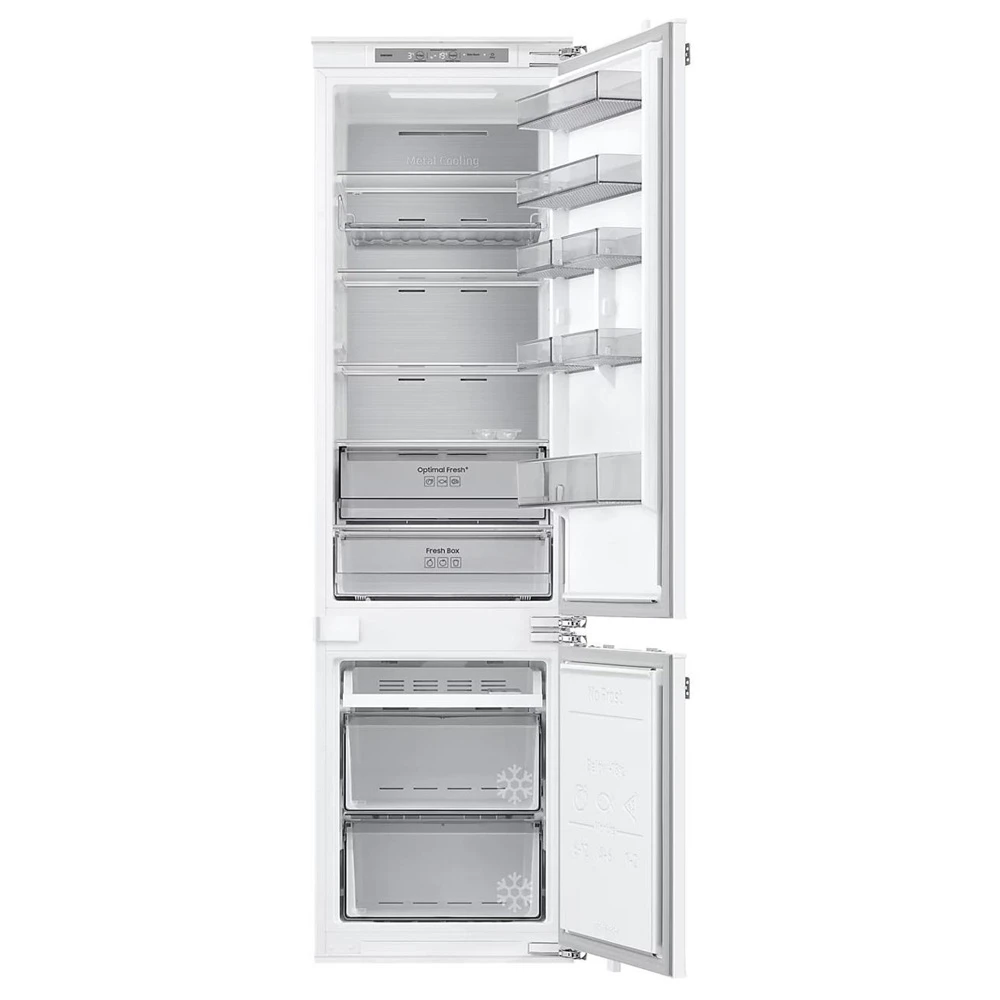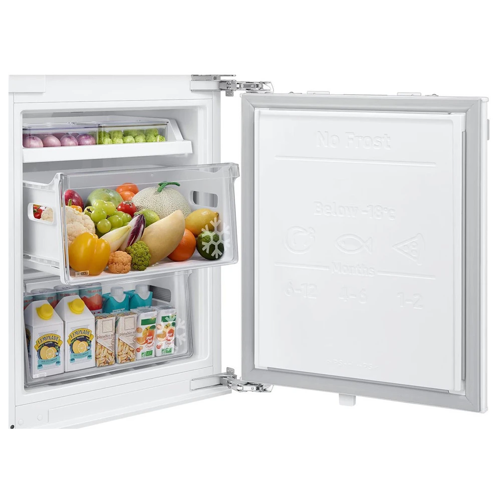 Samsung BRB80F30ADF0EO este o combina frigorifica incorporabila cu No Frost si congelator jos, conceputa sa se ascunda in spatele frontului de mobilier si sa ofere organizare pe zone. Volumul util total este 298 l: 224 l in frigider si 74 l in congelator. Este o solutie comoda pentru cumparaturi zilnice, cind vrei produse proaspete la indemina si congelarea separat, jos.