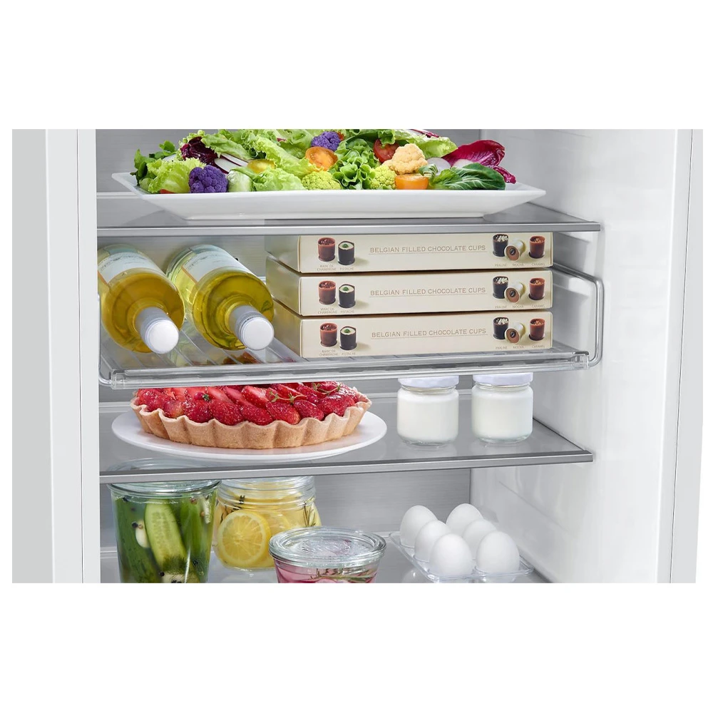 Spatiul este gandit practic: in frigider sint 4 rafturi solide din sticla si 7 rafturi pe usa, plus zona de prospetime pentru legume si carne. In congelator exista 1 raft fix si 2 sertare, iar tavita pentru gheata este inclusa, ca sa pastrezi rezervele ordonate si usor de gasit.