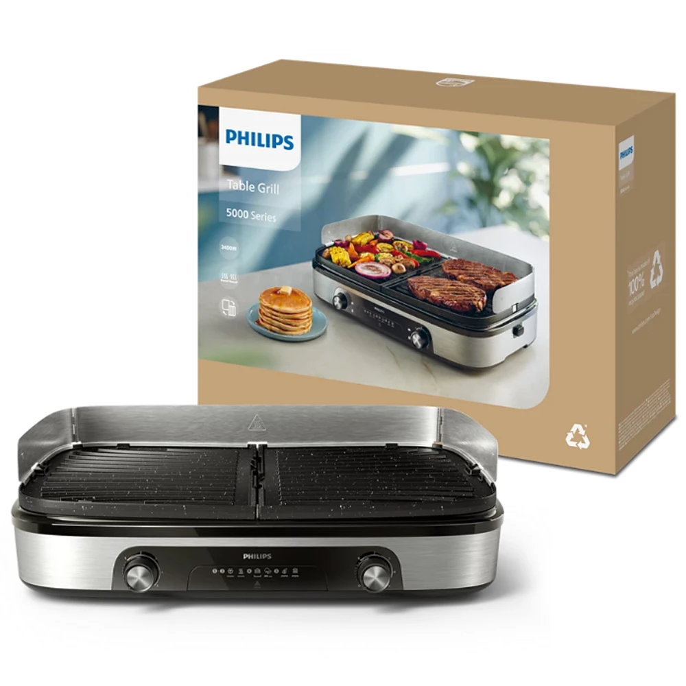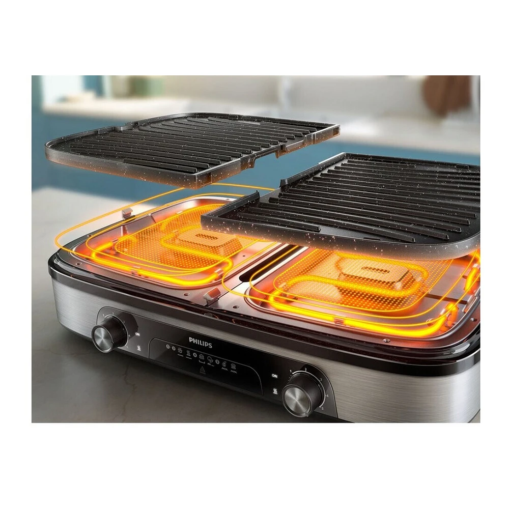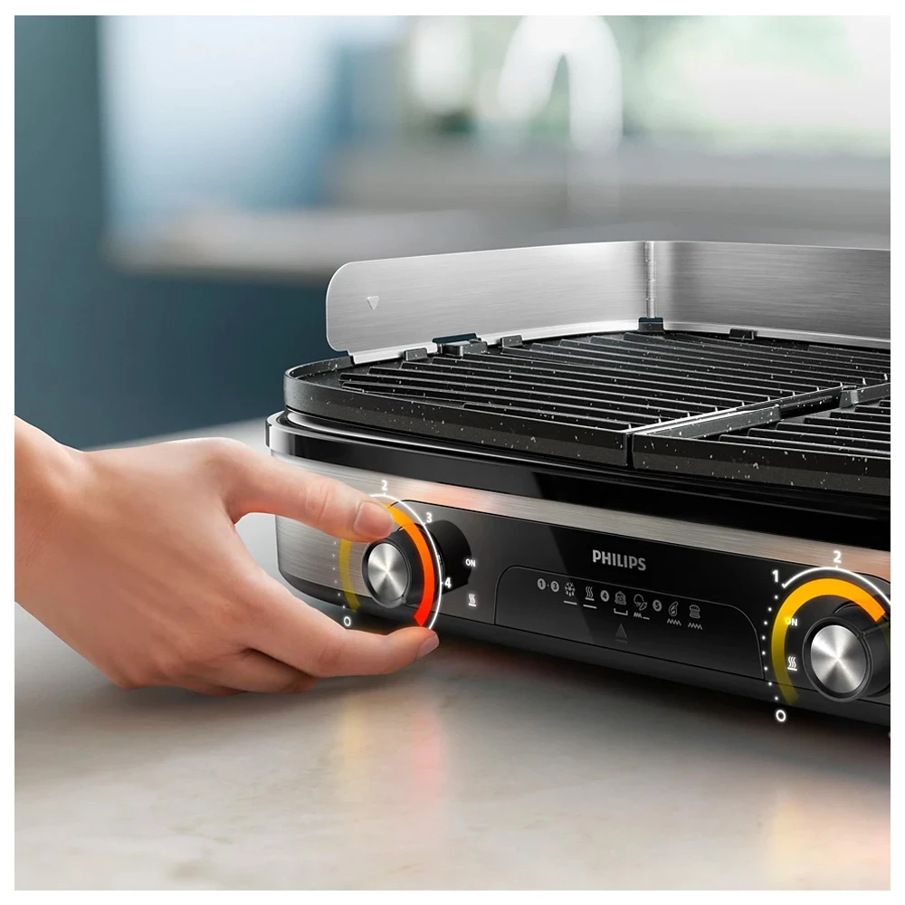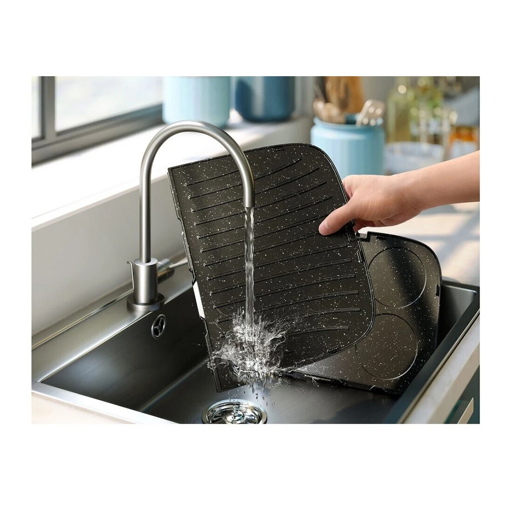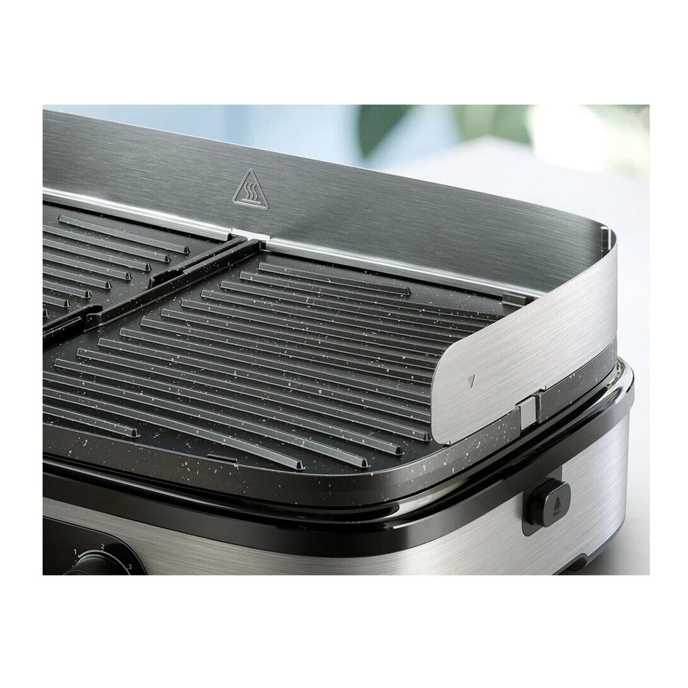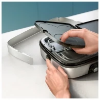 Placile sunt detasabile si au strat antiaderent: alimentele nu se lipesc, iar curatarea dureaza doar cateva minute. Carcasa din aluminiu adauga rezistenta si stabilitate. In pachet sunt incluse 2 accesorii, astfel poti trece mai repede intre sarcini diferite. Tavita si placile se spala usor dupa gatit, fara sa demontezi tot aparatul. Cu greutatea de 5,3 kg, grillul sta ferm pe masa si nu aluneca la apasare.