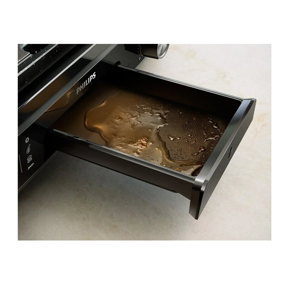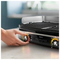 Grillul electric Philips HD6222/90 este alegerea pentru cei care vor sa gateasca acasa carne, peste si legume cu o crusta frumoasa si cu minimum de batai de cap. Modelul este finisat in negru cu accente din inox si este gandit pentru utilizare zilnica. Cu puterea de 2400 W, grillul ajunge rapid la temperatura si te ajuta sa economisesti timp. Constructia deschisa e practica atunci cand pregatesti mai multe portii si vrei control vizual.