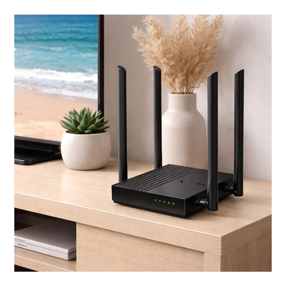Functioneaza pe doua frecvente — 2.4 GHz si 5 GHz, permitand distribuirea eficienta a traficului. Viteza Wi-Fi ajunge pana la 867 Mbps, fiind ideala pentru streaming si navigare. Cele patru antene externe detasabile imbunatatesc acoperirea.