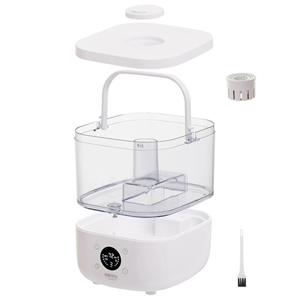 Carcasa din plastic, dimensiunile compacte de 25.6 × 21.9 × 25 cm si greutatea de 1.8 kg permit amplasarea usoara pe noptiera, comoda sau birou. Daca ai nevoie de un umidificator ultrasonic cu rezervor mare, control tactil si mai multe functii utile, Camry CR7973w este o alegere inspirata pentru confort constant pe tot parcursul zilei.