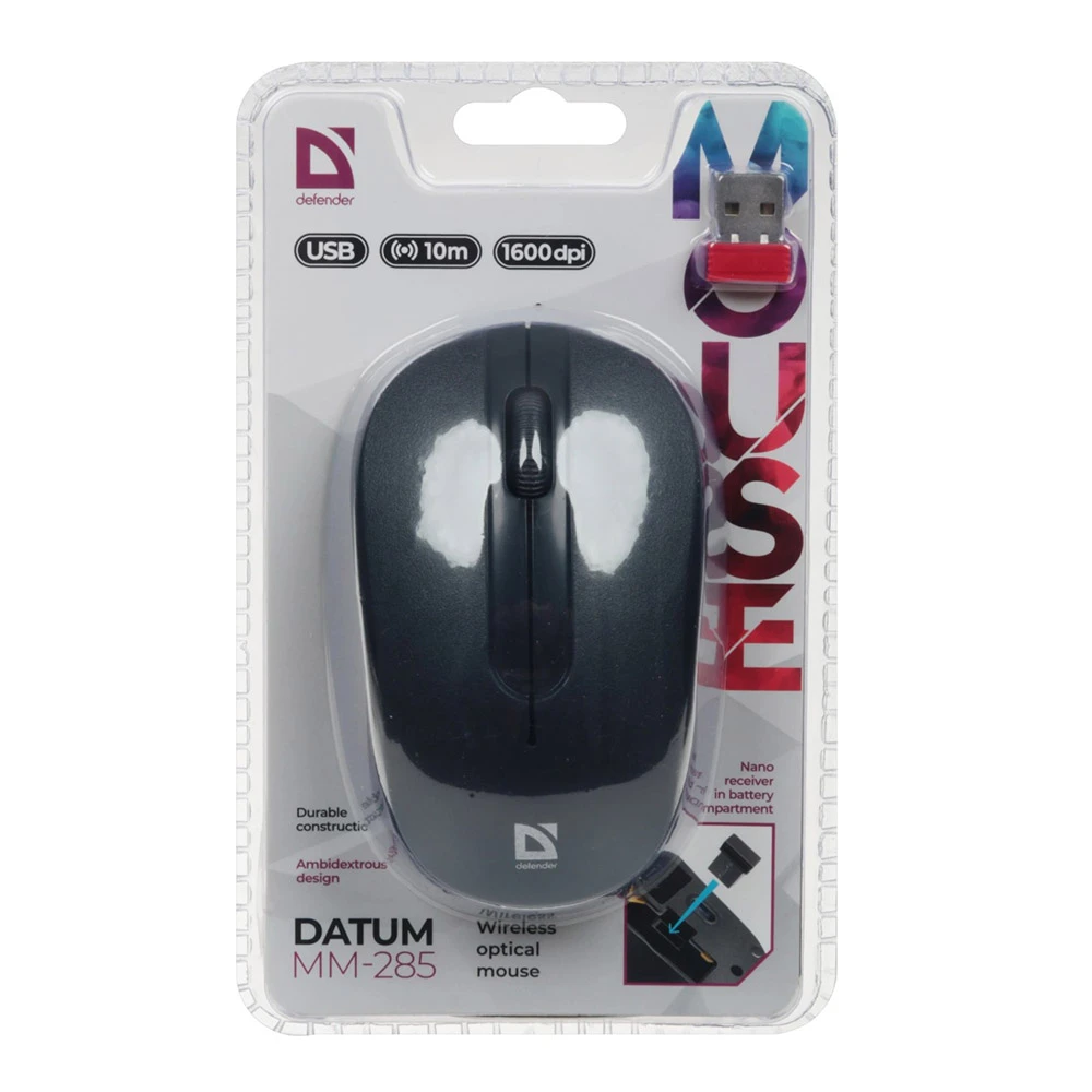 Беспроводная мышь Defender Datum MM-285 — практичное решение для дома и офиса, когда важны свобода движения и стабильное подключение. Модель работает по радиоканалу 2.4 ГГц через компактный USB-наноприемник и уверенно держит связь на расстоянии до 10 м.