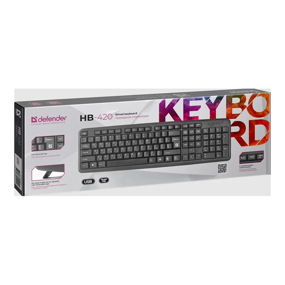 Defender HB420 рассчитана на повседневную печать: классическая компоновка помогает быстро набирать текст без привыкания. Подключение по USB, как указано в описании, запускается сразу после соединения с компьютером, без поисков драйверов и ручной настройки. Сегмент модели — «Дом и Офис». На товар предоставляется гарантия 24 месяца, страна производства — Китай.