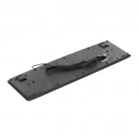 Для подбора удобного угла наклона предусмотрены откидные ножки: можно приподнять заднюю часть и снизить нагрузку на кисти. Габариты корпуса 44,5 × 14,2 см при высоте 2 см — это привычный полноразмерный формат, который легко размещается рядом с мышью. Корпус пластиковый, цвет — чёрный; влагозащиты и тканевой оплётки кабеля нет, поэтому лучше избегать пролитий. Вес — 0,36 кг.