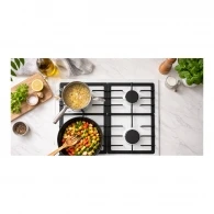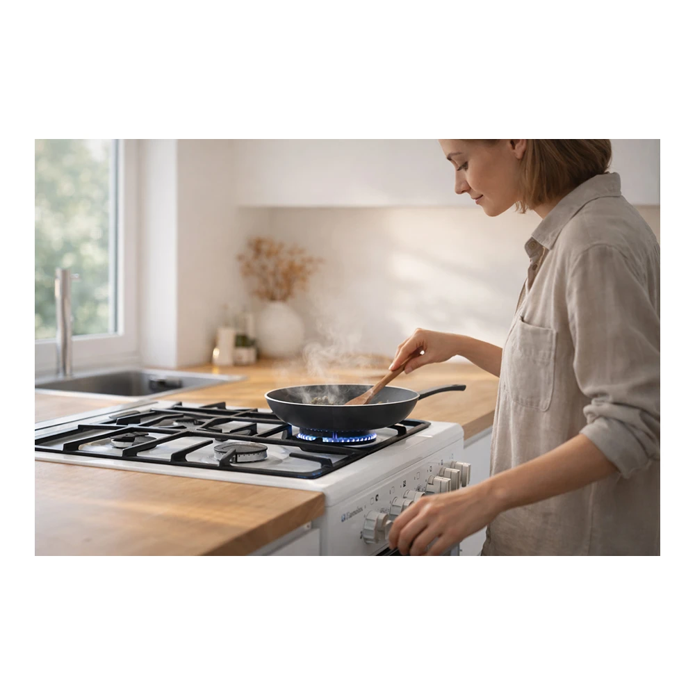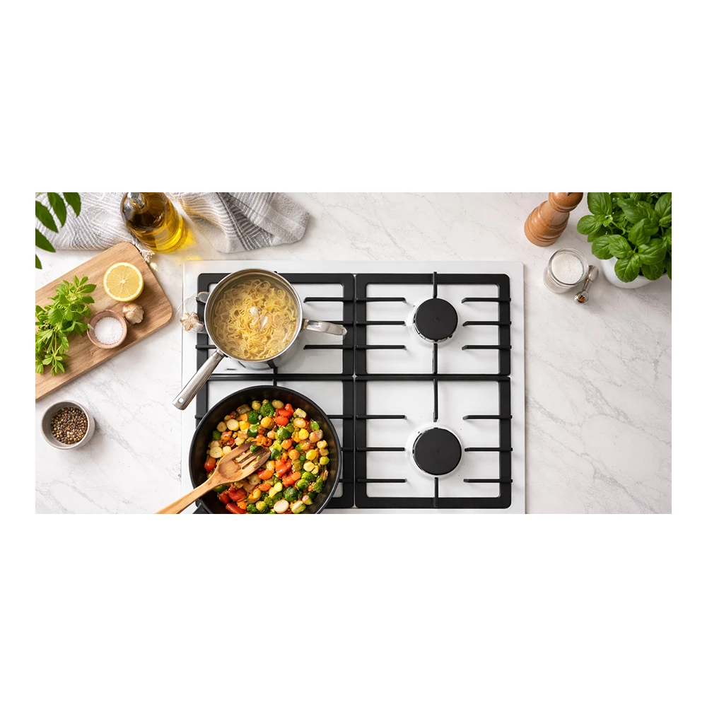 Варочная поверхность эмалированная: легко отмывается после ежедневной готовки и не боится брызг. Четыре конфорки дают место для посуды разного диаметра, чтобы суп, гарнир и соус готовились параллельно. Две чугунные решетки устойчиво держат кастрюли и сковороды, а электроподжиг конфорок помогает включать пламя одной рукой. Газконтроль повышает безопасность — подача газа прекращается при затухании.