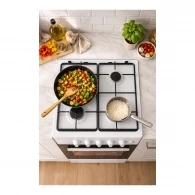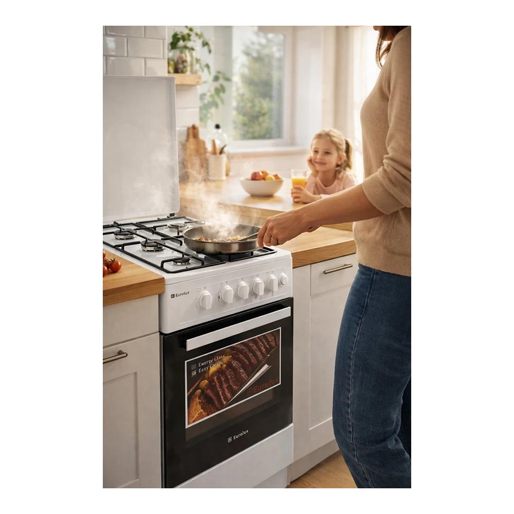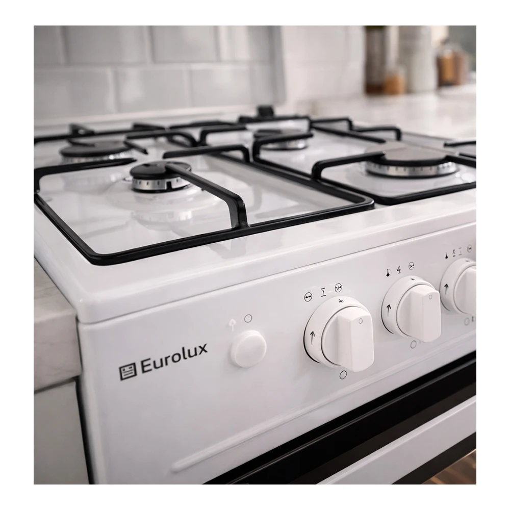 Газовая плита Eurolux TG5540IW — практичное решение для кухни, где важны простота, стабильный огонь и понятное управление. Модель рассчитана на ежедневную готовку: 4 конфорки и газовая духовка на 54 л помогают одновременно варить, жарить и запекать, не занимая лишнее место — ширина плиты 50 см при стандартной высоте 85 см.