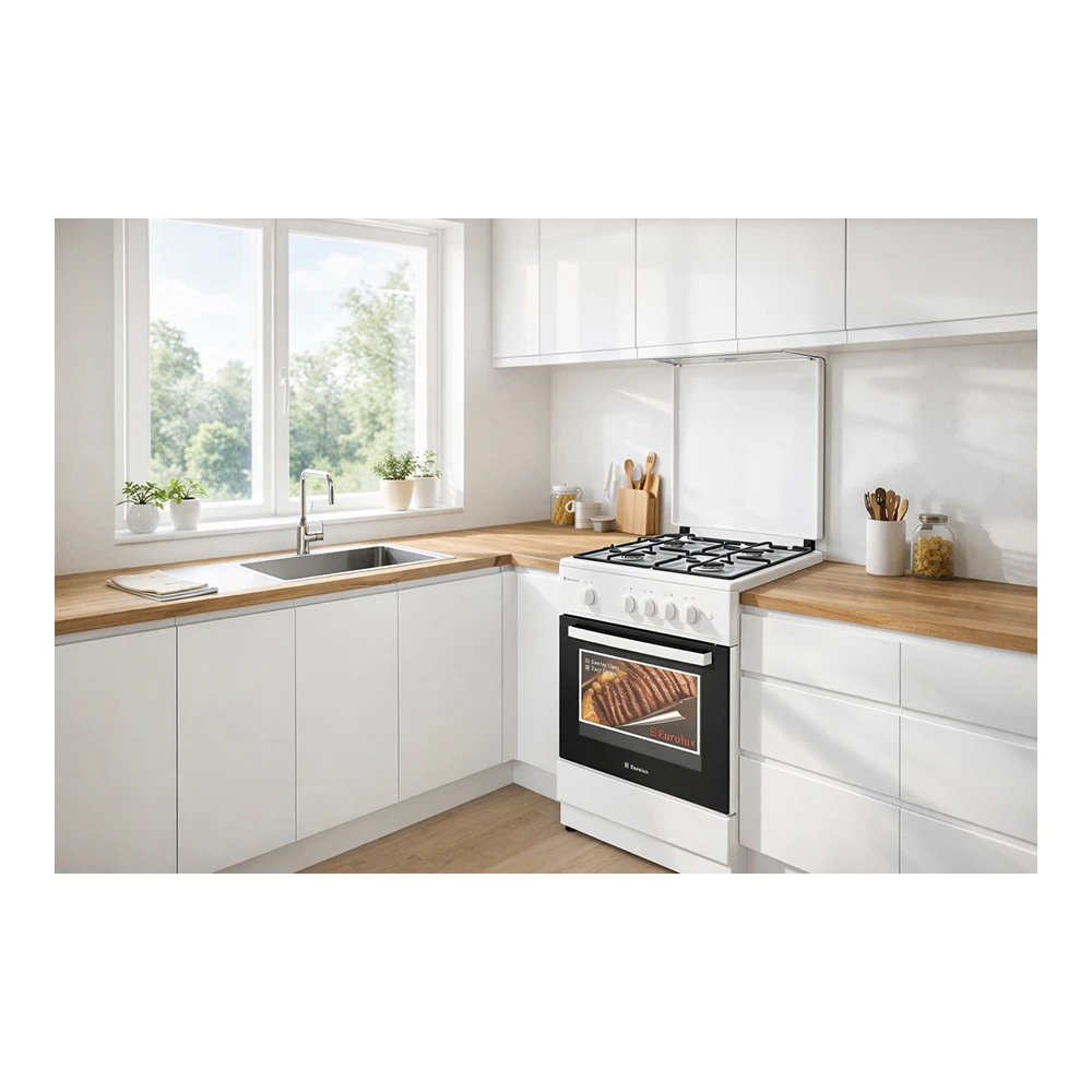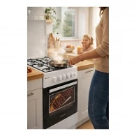 Духовка газовая, с традиционной очисткой и максимальной температурой 250 °C — удобно для запекания мяса, овощей, пирогов и домашней выпечки. Дверца с 2-слойным стеклом удерживает тепло стабильнее и делает использование комфортнее в повседневном режиме.