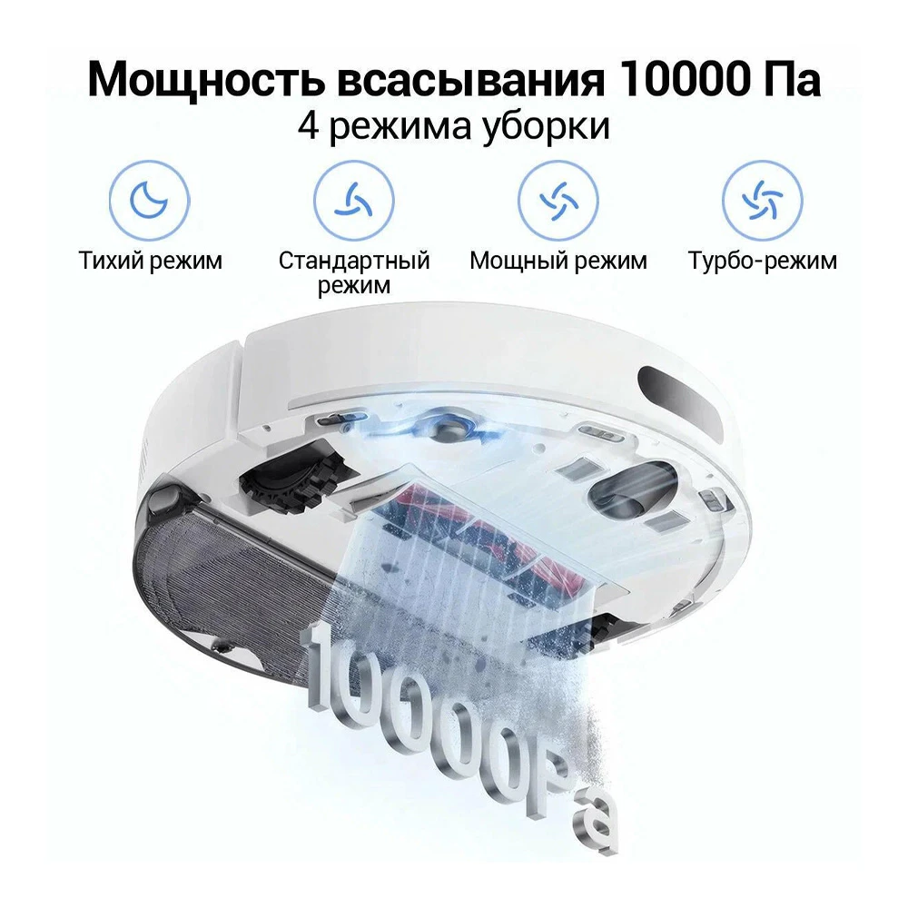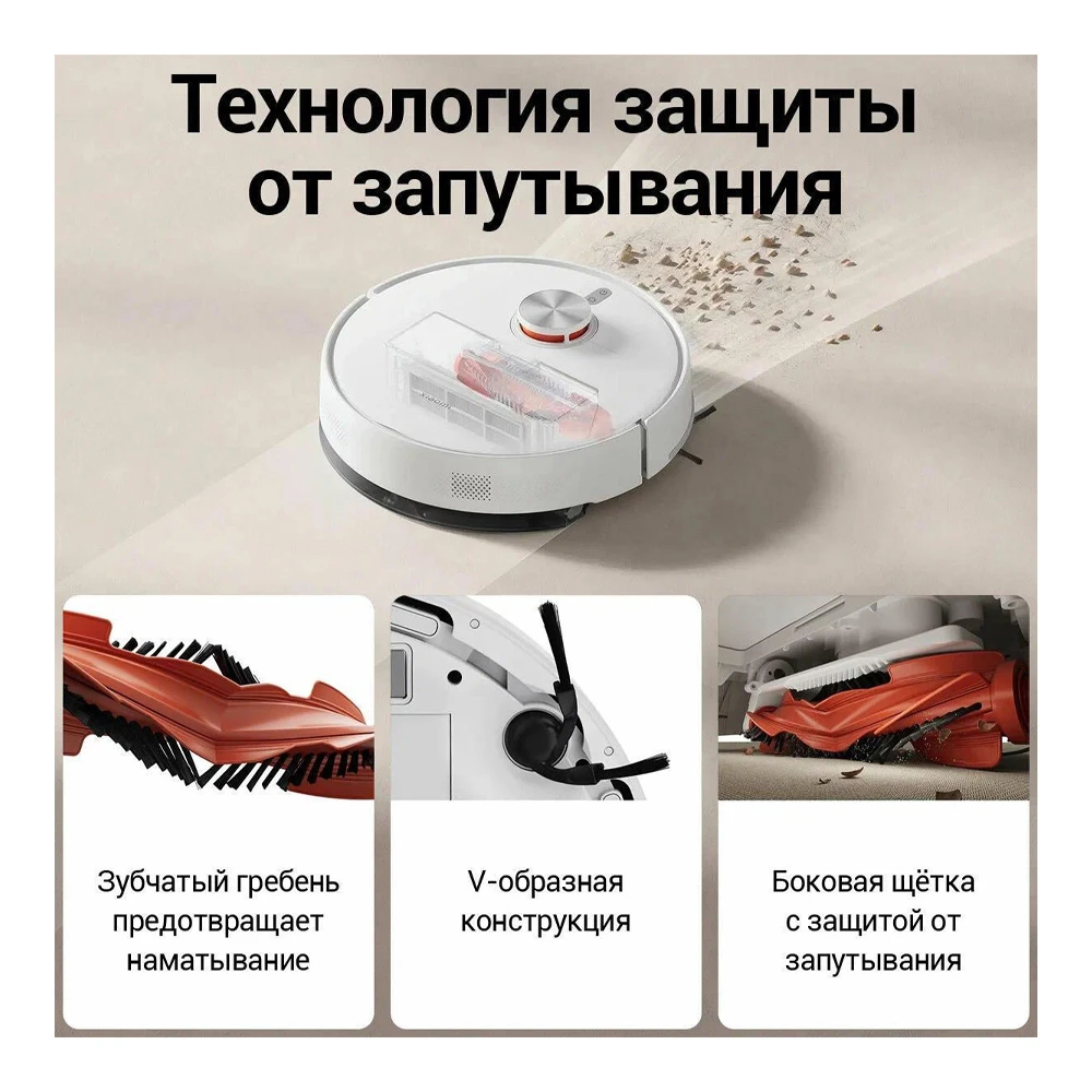 Сила всасывания достигает 10000 Па, поэтому робот уверенно собирает пыль, крошки и шерсть домашних животных с твердых покрытий и ковров. Для снижения наматывания волос применяется многомерная антизапутывающая технология с V-образной основной щеткой и антизапутывающей боковой щеткой.