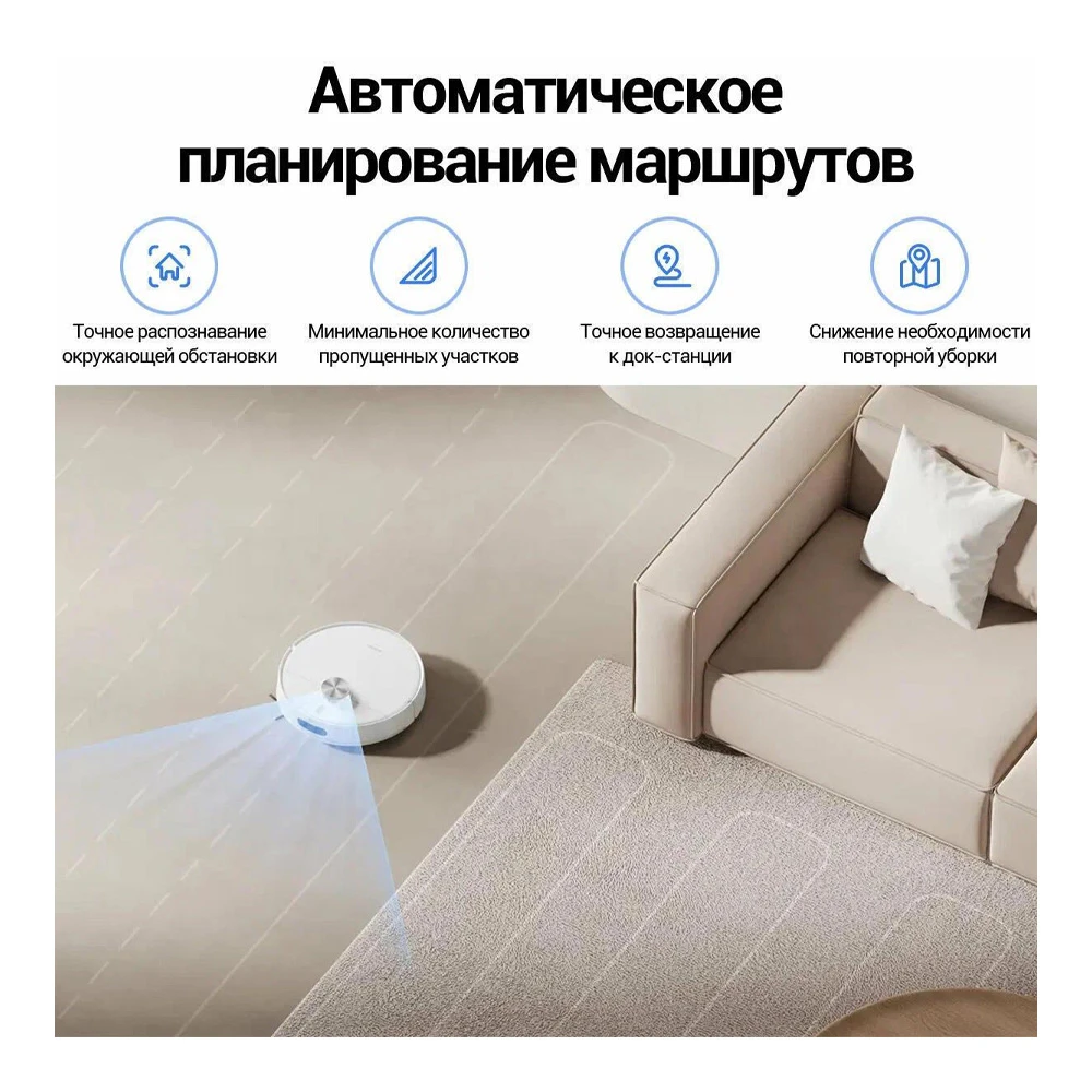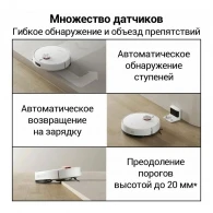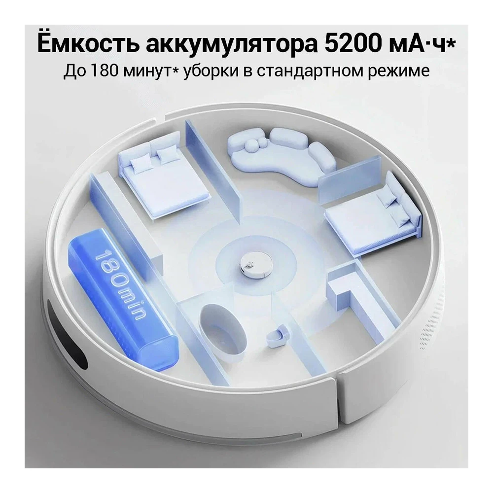 Пылесборник объемом 520 мл позволяет дольше убирать без частого опорожнения. Аккумулятор номинальной емкостью 5200 мА·ч обеспечивает работу до 180 минут в стандартном режиме при одновременной сухой и влажной уборке, а при низком заряде робот автоматически возвращается на док-станцию.