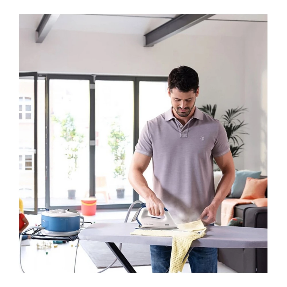 Сильная сторона Braun IS2143BL — уверенная подача пара. Постоянная подача составляет 125 г/мин, паровой удар достигает 420 г/мин, а давление пара — 6 бар. Благодаря этим характеристикам устройство помогает быстрее разглаживать стойкие складки, освежать вещи вертикально и комфортно работать с рубашками, брюками, шторами и домашним текстилем.