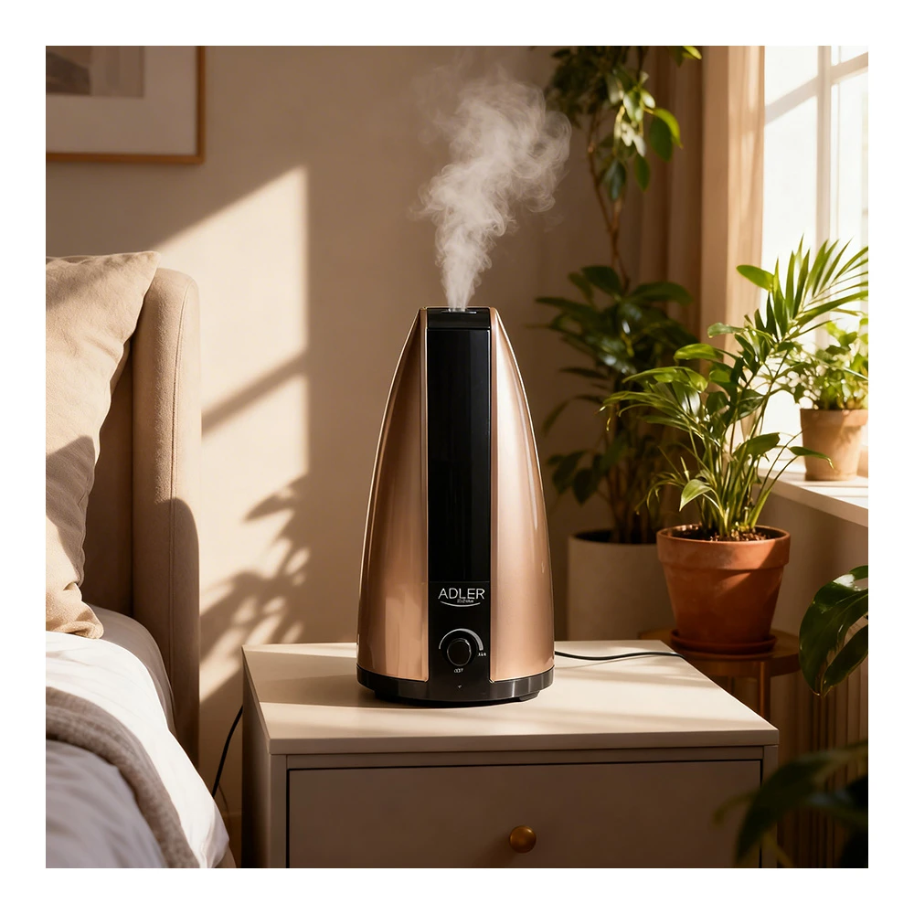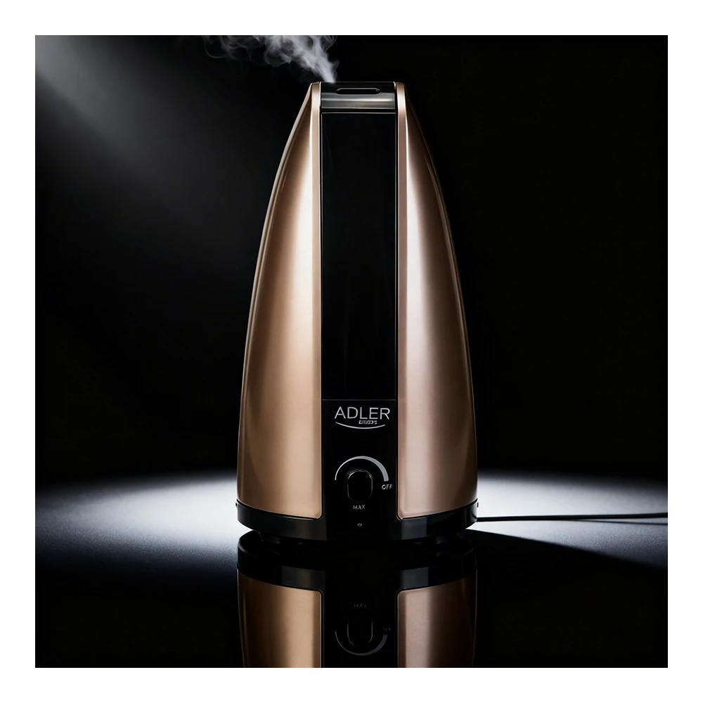 Увлажнитель воздуха Adler AD7954 — компактное и практичное решение для поддержания комфортного микроклимата дома или в офисе. Это ультразвуковой увлажнитель воздуха, рассчитанный на помещение площадью до 15 кв. м, поэтому он особенно хорошо подходит для спальни, детской комнаты, кабинета или рабочего места. Модель выполнена в бронзовом цвете, имеет аккуратный современный дизайн и не занимает много места, а резервуар объемом 1,8 л помогает поддерживать оптимальный уровень влажности в течение дня. По данным карточки товара на Bomba.md, устройство имеет мощность 18 Вт, производительность до 0,1 л/ч, механическое управление и функцию регулировки интенсивности пара. :